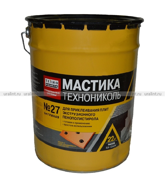 Мастика приклеивающая ТЕХНОНИКОЛЬ № 27 предназначена для приклеивания плит из экструзионного пенополистирола к битумным, битумно-полимерным изоляционным материалам, а также к бетонным поверхностям в системах изоляции фундаментов. Расход: при нанесении полосами 0,6-1 кг/м², при нанесении точками 0,5-0,8 кг/м². При укладке плит на гидроизоляционный слой, имеющий в качестве защитного слоя пленку, её требуется удалить при помощи пропановой горелки.