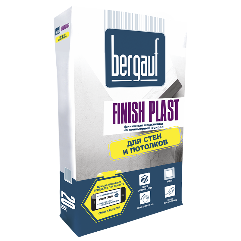 Шпаклевка Finish Plast предназначена для финишного шпаклевания и устранения мелких дефектов на минеральных (бетонные, железобетонные, цементные и цементно-известковые штукатурки), заранее подготовленных основаниях, на стенах и потолках.