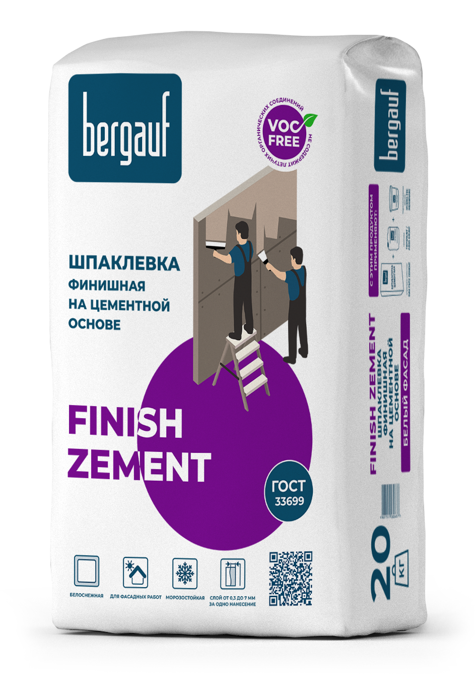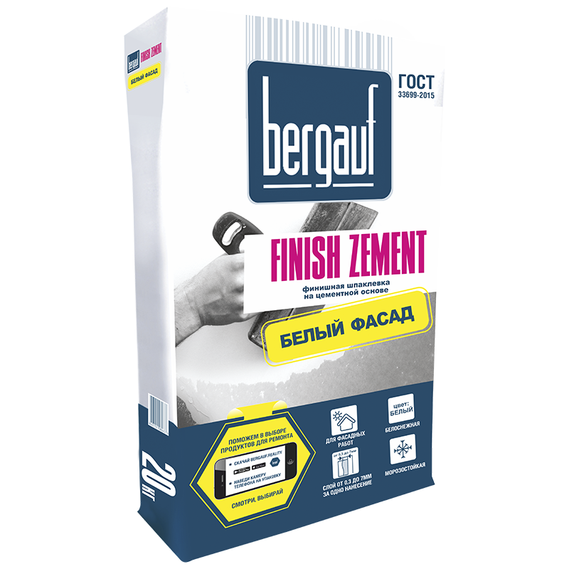 Бергауф Finish Zement – шпаклевка белоснежная водоустойчивая на цементной основе. Наносится только вручную (слой 0,3-7 мм) без применения специализированных машин. Подходит для отделки объектов с нормальным и повышенным уровнем влаги. Используется для цокольной и фасадной отделки. Предназначен для бетонных, железобетонных, ячеистобетонных, цементных поверхностей. Применяется при кладке плитки, декоративном оштукатуривании, оклейке обоями, финишном шпаклевании, окрашивании.