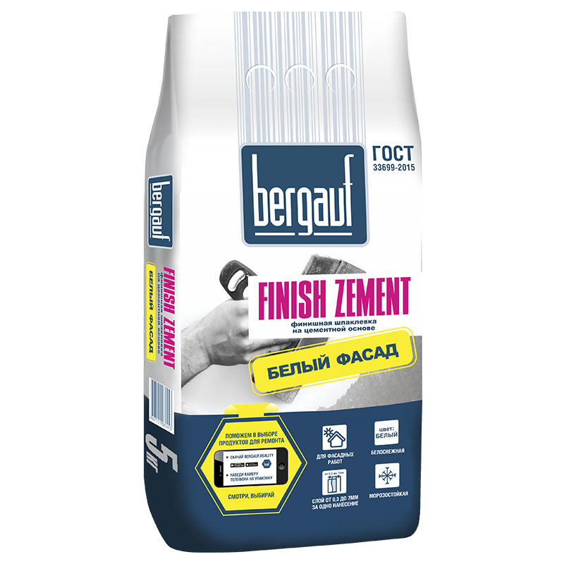 Бергауф Finish Zement – шпаклевка белоснежная водоустойчивая на цементной основе. Наносится только вручную (слой 0,3-7 мм) без применения специализированных машин. Подходит для отделки объектов с нормальным и повышенным уровнем влаги. Используется для цокольной и фасадной отделки. Предназначен для бетонных, железобетонных, ячеистобетонных, цементных поверхностей. Применяется при кладке плитки, декоративном оштукатуривании, оклейке обоями, финишном шпаклевании, окрашивании.