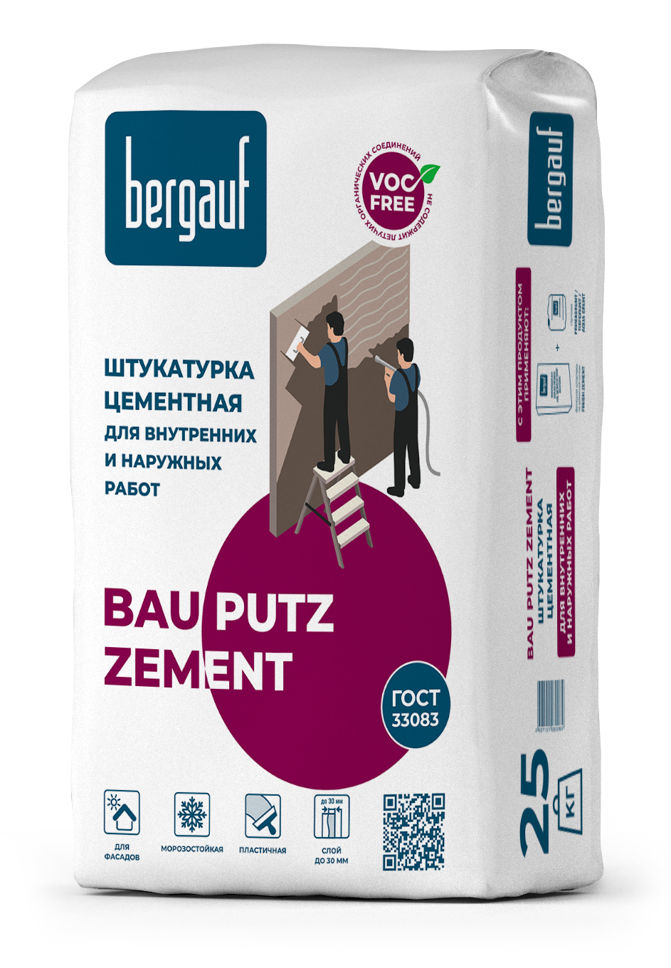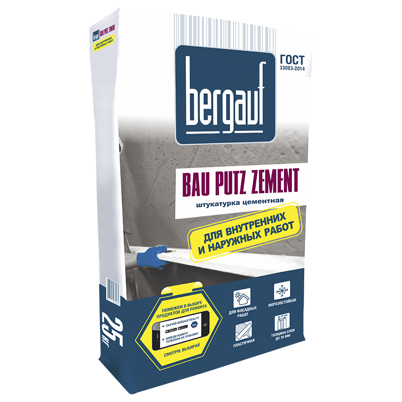 Бергауф Bau Putz Zement – штукатурка водостойкая, морозоустойчивая, на цементной основе. Рекомендована к использованию для фасадной отделки. Подходит для кирпичных, бетонных, железобетонных, ячеистобетонных поверхностей.